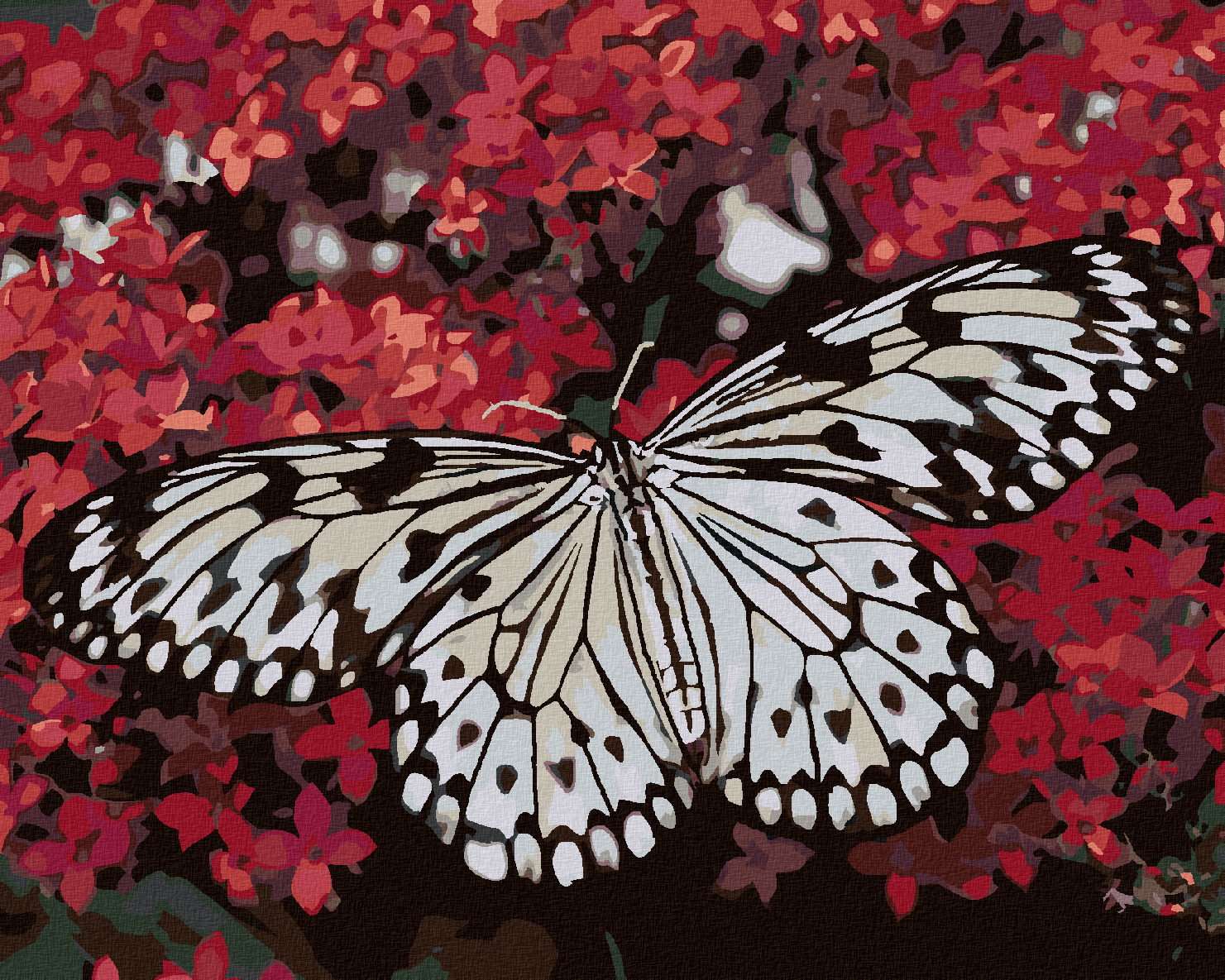 Malování podle čísel - BÍLÝ MOTÝL A ČERVENÉ KVĚTINY - 40x50 cm, vypnuté plátno na rám