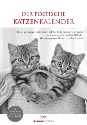 - Premiumqualität: 150g/m² Bilderdruckpapier, extrastarke 1.000g/m² Rückwand - Deutschsprachiges Kalendarium - Feiertage (DE/AT/CH) - Mit Platz für Notizen - Auf den Rückseiten u. a. Jahresübersichten 2019/2020, 100-jähriger Kalender, Ferientermine (DE/AT/CH) - Mit Wire-O-Bindung - Insgesamt sind bei Alpha Edition 40 Bildkalender mit den unterschiedlichsten Motiven im Format 24 x 34 cm erhältlich Dieser schöne Wandkalender mit stilvollen schwarz-weiß Aufnahmen von süßen Schmusekatzen ist ein echter Hingucker, der Sie treu durch das Jahr begleitet. Die 12 Schwarzweiß-Fotografien im Poetischen Katzenkalender werden jeweils von einem neckischen Zitat rund um das Thema Katzen begleitet. Dank des Bild-Formats von 24 x 34 cm kommen die verspielten Vierbeiner selbst aus einiger Entfernung perfekt zur Geltung. Zusätzlich fügt sich das übersichtliche Kalendarium, welches Monat für Monat Zusatzinformationen liefert, harmonisch unter den Fotomotiven an. Der ideale Kalender für alle Katzenfreunde!