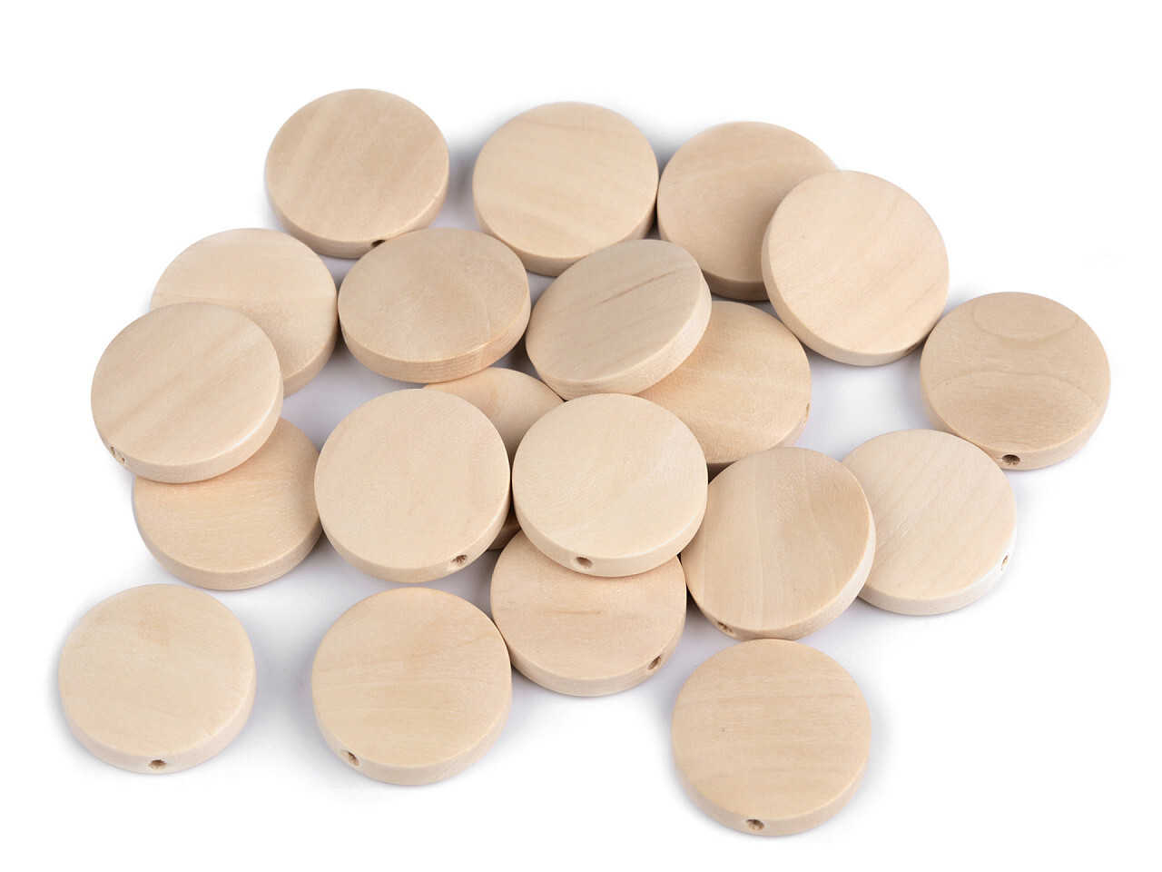 Dřevěné korálky ve tvaru kulaté placičky o průměru 20 mm jsou nelakované, což zdůrazňuje jejich přírodní vzhled a umožňuje je snadno upravit podle vlastních představ. Výborně se hodí k navlékání na silon či jiné návlekové materiály. Využijete je při výrobě náramků, náhrdelníků, lapačů snů, nebo jako originální přívěsky ke klíčům či kabelce. Jejich přírodní povrch i tvar podporují vaši kreativitu a umožňují vytvořit unikátní a osobité doplňky.