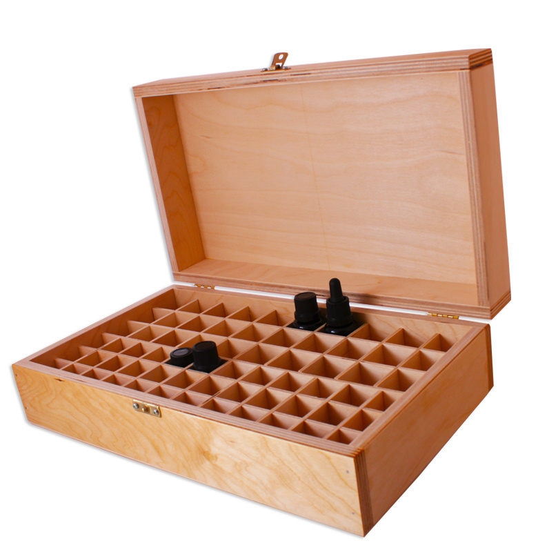 Pro uložení (uskladnění) éterických olejů v objemech 5ml, 10ml a 20ml (i s kapacími pipetami), z lakované překližky. Určeno pro 30ks 20ml lahviček a 36ks 5ml a 10ml lahviček. Rozměry: výška 110mm, šířka 371mm, hloubka 214mm.