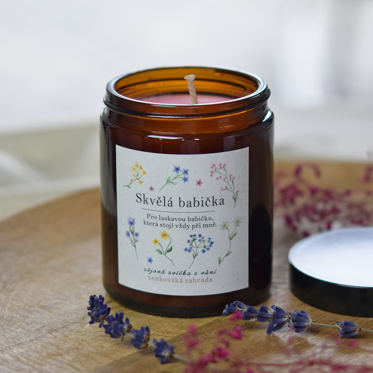 Svíčka obsahuje pouze kvalitní suroviny jako je sójový vosk, 100 % přírodní knot, a příjemnou vůni s názvem Venkovská zahrada.