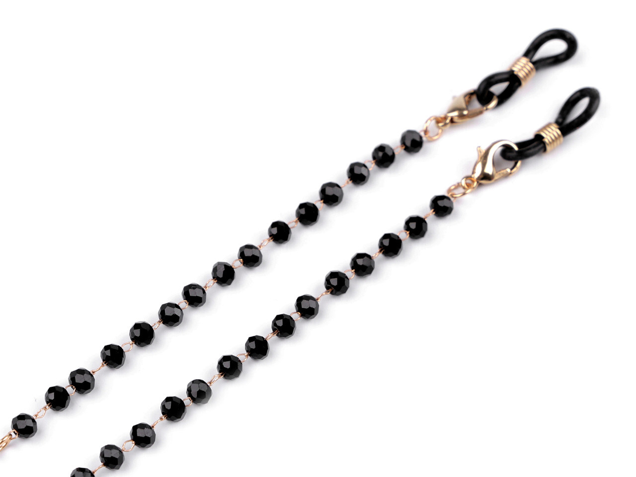 Elegantní řetízek na brýle má horní část ozdobenou skleněnými broušenými korálky. Je praktickým pomocníkem pro všechny, kteří si nezvykli nosit brýle na hlavě, přitom ale potřebují mít brýle neustále u sebe. Na řetízku můžete brýle nosit zavěšené kolem krku. Na koncích má karabinky a silikonové gumičky, které se navlečou na nožičky brýlí. Barva řetízku je černo-zlatá, ostatní kovové komponenty mají barvu zlatou.
