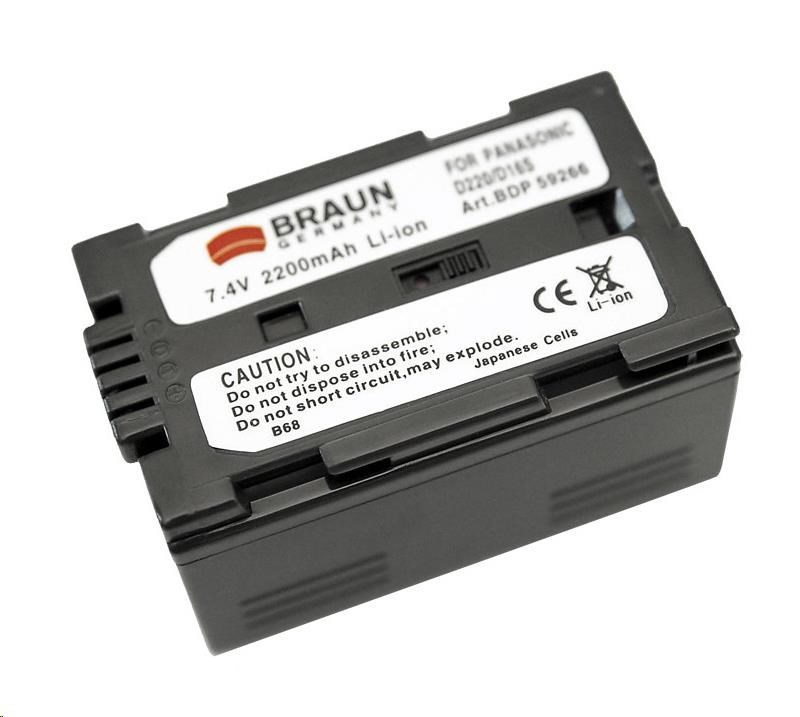 Li-Ion akumulátor Braun BDP-PD220 (M, PANASONIC D220, 14, 16 - 7,4 V/2200 mAh) pro digitální videokamery PANASONIC HC-X1000, NV D16, D89, DA1, DS3, DS8, DS11, DS12, DS15, DS25, DS27, DS28, DS29, DS30, DS33, DS35, DS37, DS38, DS50, DS55, DS60, DS65, DS68, DS77, DS88, DS99, DS150, DS990, EX1, EX3, EX21, GS1, GS2, GS3, GS5, GS11, GS15, GX7, MD9000, MX1, MX2, MX5, MX7, MX8, MX300, MX340, MX350, MX500 a HDC Z10000. Tento akumulátor je dodáván v částečně nabitém stavu. Před použitím je vhodné akumulátor nabít. Plné kapacity akumulátoru může být dosaženo až po cca 4-5 nabíjecích cyklech. V případě více modelů jednoho typu akumulátoru s různou kapacitou vybírejte podle doporučení výrobce přístroje !!! Vyšší kapacita umožňuje delší dobu záznamu, ale větší rozměr (výška) akumulátoru může komplikovat nebo zcela bránit použití !!!