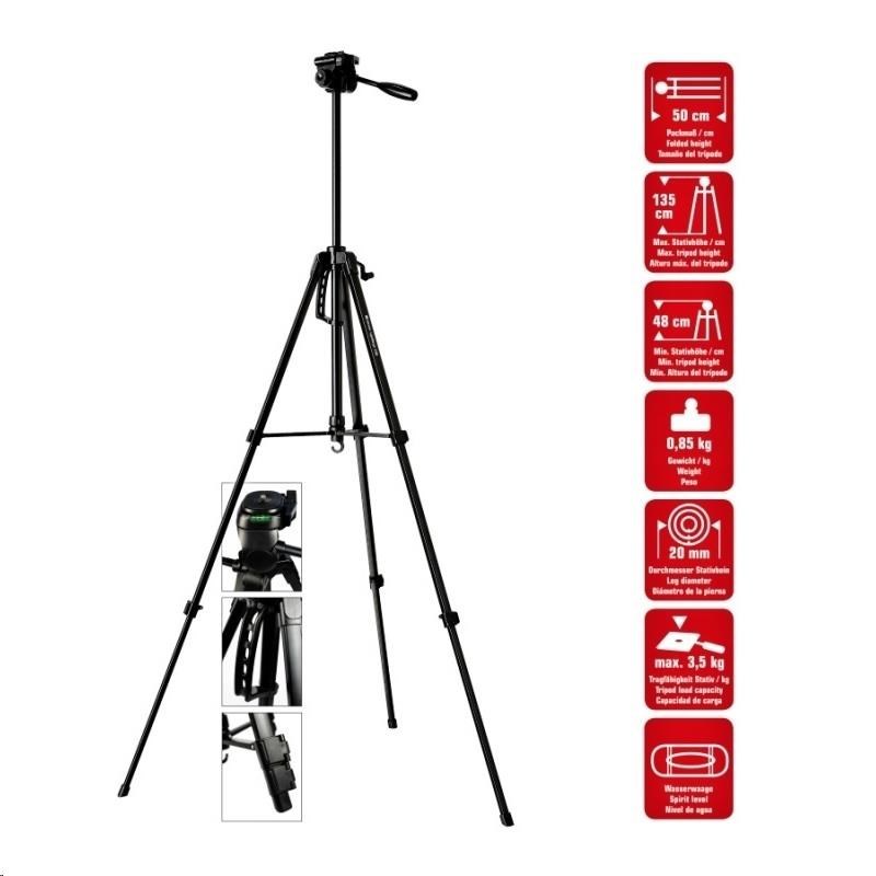 Lehký hliníkový foto/video stativ, 3-směrná hlava s výměnnou destičkou, vodováha, 3 segmenty noh se svorkami, profil 20mm, zatížení maximálně 3,5kg, rozměry: složený 50cm / výška 48-135cm, hmotnost 850g, barva černá, včetně pouzdra. Středový sloupek se vzpěrami pro vyšší stabilitu, nastavení výšky kličkou, háček na pověšení příslušenství nebo závaží, plastové ucho pro transport, nohy zakončené gumou.