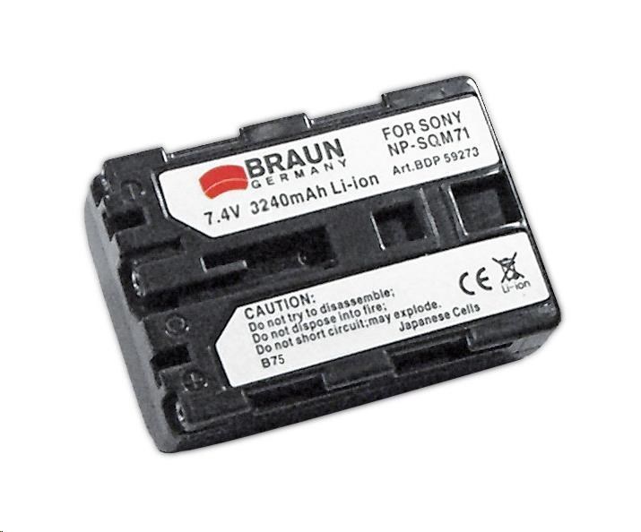 Li-lon akumulátor Braun BDP-SQM71 (T, Sony "M" NP-FM70, QM71 - 7,4 V/3240 mAh) pro digitální videokamery SONY DCR DVD91, DVD101, DVD100, DVD200, DVD201, DVD300, DVD301, HC14, HC88, PC6, PC8, PC9, PC100, PC101, PC103, PC105, PC110, PC115, PC120, PC330, TRV6, TRV8, TRV10, TRV11, TRV12, TRV14, TRV15, TRV16, TRV17, TRV18, TRV19, TRV20, TRV22, TRV24, TRV25, TRV27, TRV30, TRV33, TRV40, TRV50, TRV60, TRV80, TRV140, TRV145, TV218, TRV230, TRV238, TRV239, TRV240, TRV245, TRV250, TRV255, TRV260, TRV265, TRV270, TRV280, TRV285, TRV325, TRV330, TRV340, TRV345, TRV355, TRV350, TRV360, TRV418, TRV428, TRV460, TRV480, TRV530, TRV725, TRV730, TRV738, TRV740, TRV828, TRV830, TRV840, TRV940, TRV950, HDR HC1, SR1. Tento akumulátor je dodáván v částečně nabitém stavu. Před použitím je vhodné akumulátor nabít. Plné kapacity akumulátoru může být dosaženo až po cca 4-5 nabíjecích cyklech. V případě více modelů jednoho typu akumulátoru s různou kapacitou vybírejte podle doporučení výrobce přístroje !!!