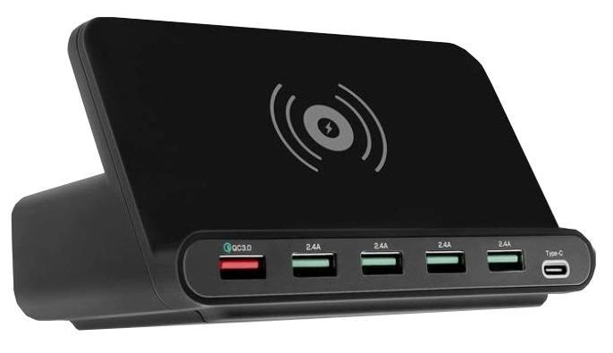 Rychlonabíjecí USB stanice až pro 6 USB zařízení o celkovém výkonu 60W s podporou technologií QC a PD. Elektronika obsahuje inteligentní čip pro identifikaci zařízení a optimalizaci nabíjecího proudu a napětí. Pro nabíjení lze využít jak standardní USB, tak moderní port USB-C. Vstup AC 100-240V; QC výstup: 5V/3A, 9V/2A, 12V/1.5A; PD USB-C výstup 5V/3A, 9V/2A, 12V/1.5A a bezdrátové nabíjení až 10W