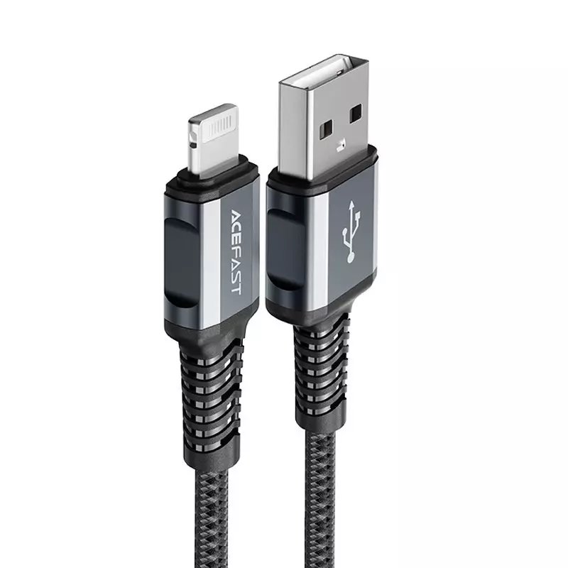 Acefast USB - Lightning kabel pro nabíjení a přenos dat. Je určen pro zařízení Apple s konektorem Lightning. Má délku 120 cm a je uzpůsoben pro práci s proudem až 2,4 A. Disponuje certifikátem MFI (Maide For iPhone), díky kterému se na telefonu nezobrazí hláška o neoriginálním příslušenství. Kabel je po celé délce opleten nylonem. Zátky mají hliníkové pouzdro. Konce kabelů jsou chráněny proti poškození v místech nejčastějšího ohybu.