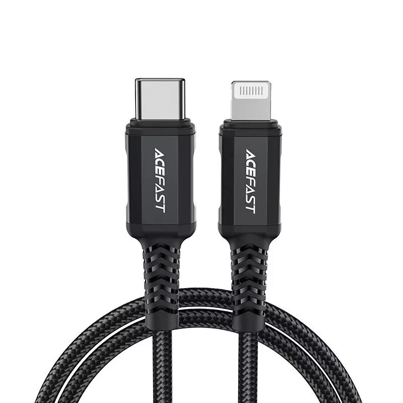 Acefast USB Type C - Lightning kabel pro nabíjení a přenos dat. Je určen pro zařízení Apple s konektorem Lightning. Je dlouhý 180 cm a je uzpůsoben pro práci s proudem 30W a 3A. Je kompatibilní s rychlonabíjením Power Delivery. Disponuje certifikátem MFI (Maide For iPhone), díky kterému se na telefonu nezobrazí zpráva o neoriginálním příslušenství. Kabel je po celé délce opleten nylonem. Zátky mají hliníkové pouzdro. Konce kabelů jsou chráněny proti poškození v místech nejčastějšího ohybu.