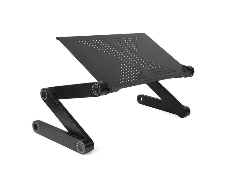 Víceúčelový skládací stolek. Super doplněk do kanceláře nebo do domácnosti. Využijete ho jako stolek na notebook, knihy, časopisy nebo také jako snídaňový stolek. Stolek má odvětrávací otvory, které při práci na laptopu jistě oceníte. Stolek je skládací a nastavitelný přesně podle vašich představ. Nabízí až 11 různých poloh, do kterých si můžete nastavit. Tento stolek lze využívat také na pracovním stole a nastavit si ho tak, aby byl laptop v úrovni vašich očí. Skládání stolku je velice jednoduché a nepotřebujete k tomu žádné nářadí. Stiskem aretačního tlačítka na každé straně nohy stolky nastavíte stolek podle vašeho úhlu. Otáčet je možné až o 360°. V balení je návod a typy, jak lze stolek poskládat. Obsah balení: