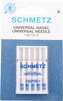 5 univerzálních jehel Schmetz s mírně zaoblenými hroty, které jsou vhodné pro práci s nejoblíbenějšími druhy látek