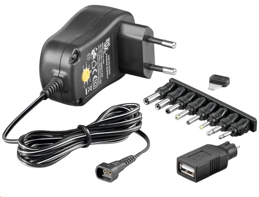 - Napájecí zdroj s proměnným napětím, ideální jako náhradní jednotka pro elektronická zařízení, jako je TV box, router, LED pásky, videokamera, digitální fotorámeček, terč na šipky, chůvička nebo hračka