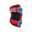 Dětské chrániče kolen a loktů v modro-červené kombinaci s motivem dinosaurů. Barevný motiv je neutrální, takže by se měl chránič líbit jak klukům tak i holčičkám, ale motiv dinosaurů pravděpodobně zaujme spíše kluky.