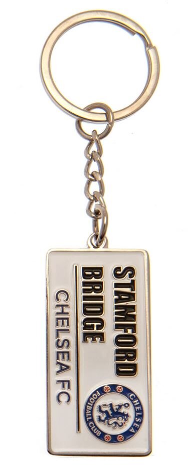 Reliéfní kovový obdélníkový přívěsek na klíče s řetízkem a děleným kroužkem. Plnobarevný smaltovaný povrch s designem pouliční cedule s nápisem: ,,Stamford Bridge\'\'. Klíčenka vyvedená v grafice znaku fotbalového klubu FC Chelsea se hodí pro každého menšího i většího fanouška britského fotbalového klubu FC Chelsea.