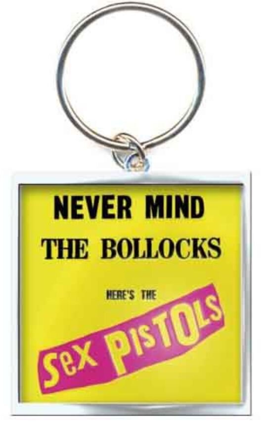 Jednostranný, kovový, obdélníkový plastický přívěsek na klíče, vyvedený v grafice alba a loga slavné britské punkové skupiny Sex Pistols.
