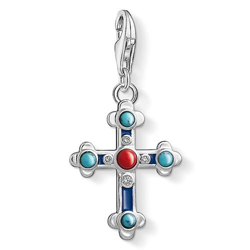 Přívěsek \"Etnický kříž\" Thomas Sabo, 1466-335-7, Charm Club, 925 Sterling silver, cold enamel, simulated coral/turquoise, zirconia
