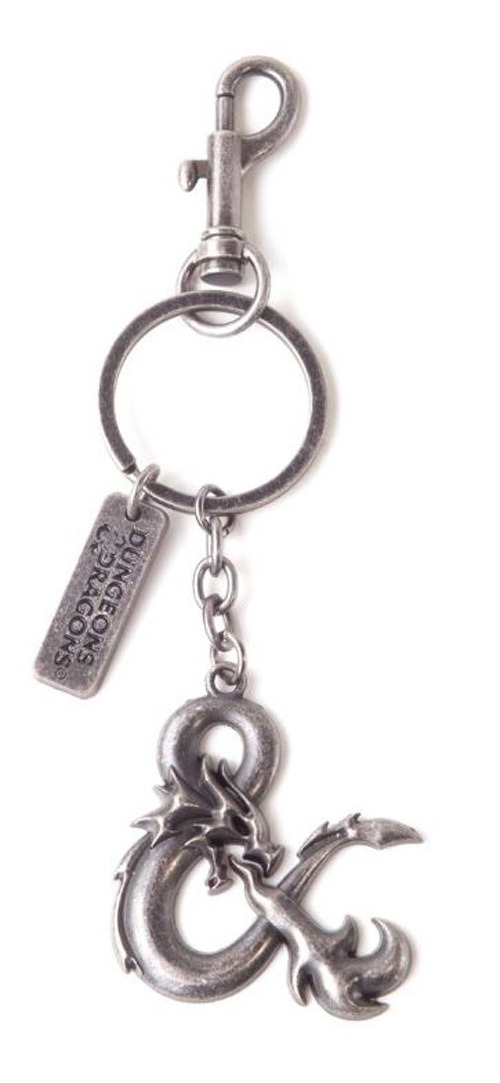 Oficiální kovový přívěšek na klíče z katalogu produktů s logem a grafikou fantasy hry Dungeons & Dragons.