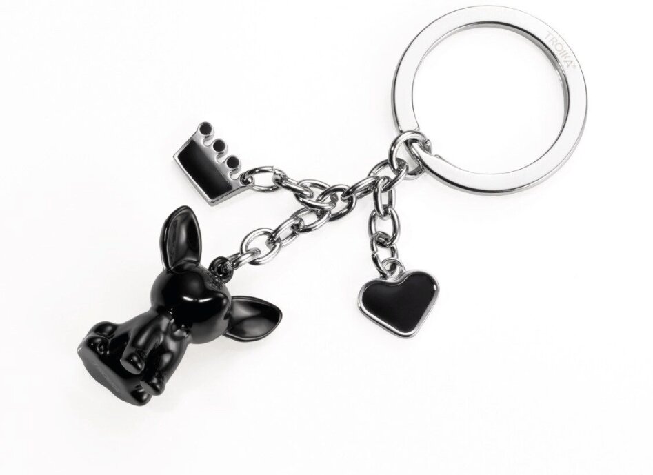 Kľúčenka Troika TRIXIBELLE pre dievčatá s 3 príveskami (psík čivava, koruna, srdiečko). Z lesklého čierneho liateho kovu a smaltovania.