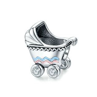 Stříbrný přívěsek korálek na náramek ve tvaru dětského kočárku zdobeného kubickými zikonky čiré barvy