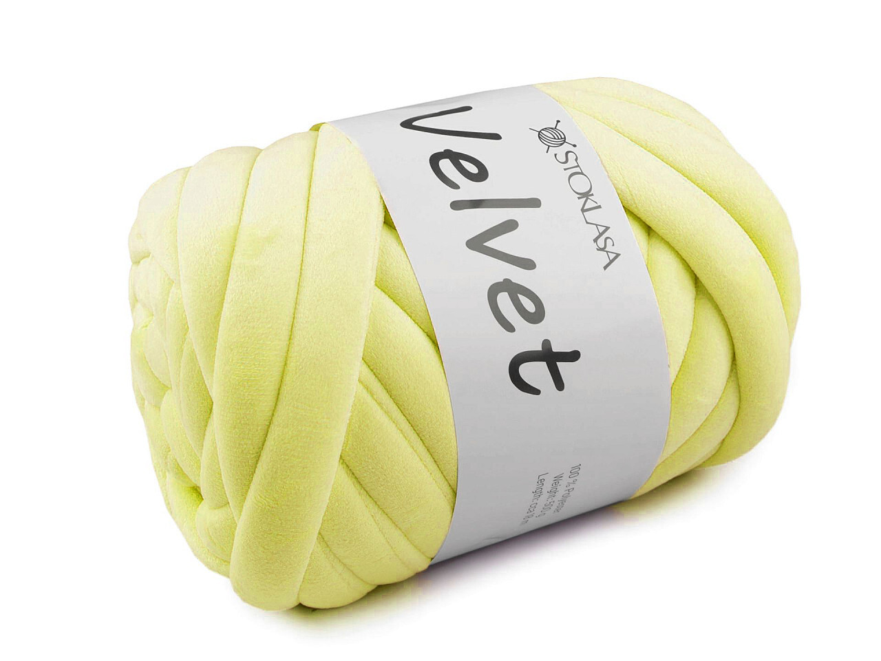 Silná příze Velvet je objemná, měkká a velmi příjemná na dotek. Tvoří ji tunýlek vyplněný vláknem. Dobře se vám s ní bude pracovat velkými jehlicemi nebo rukama.