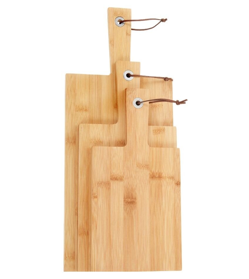 Tato sada prkének je nejen funkční, ale také esteticky příjemná. Bambusový materiál je odolný a snadno se udržuje, což z něj činí ideální volbu pro každodenní použití v kuchyni. Kovový kroužek a kožené lano dodávají prkénekům moderní a praktický vzhled.