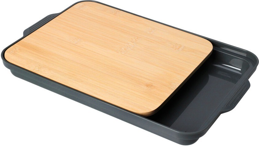 CUTTING BOARD BAMBOO (PHYLLOSTACHYS) INCLUDING STORAGE BOX PP WITH HANDELS. SIZE: 375X240X35MM, WEIGHT: 673 GRAM. STORAGE BOX IN ANTHRACITE 425C COLOUR. EACH WITH COLOR SLEEVE/ 370X250X40MM, Shrink+paper sleeve: , 370X240X35MM / CFT 1,61,(17.800/40ft HQ)