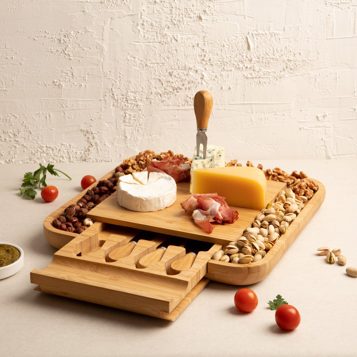 Výsuvná zásuvka - 4 nože na různé druhy sýrů - Délka nožů: 12 cm - Rozměry prkénka: 32 x 32 cm - Bambusové prkénko na sýry