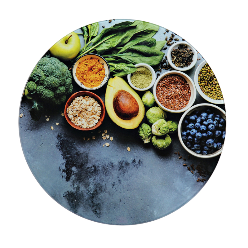 KESPER Multifunkční skleněná deska kulatá, motiv Zdravé vaření 27 x 27 x 0,7 cm