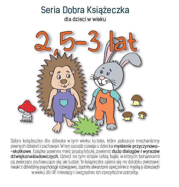 Seria Dobra Książeczka jest napisana i narysowana zgodnie z najnowszym stanem wiedzy psychologii rozwojowej. Na okładce posiada jasny, konkretny, rzeczowy i ciekawy opis etapu rozwoju dziecka.