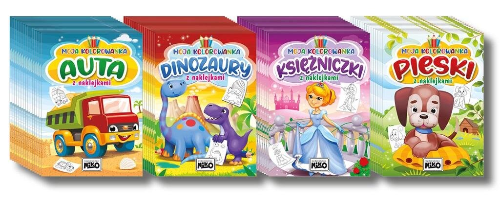 Seria MOJA KOLOROWANKA Z NAKLEJKAMI to zbiór prostych obrazków do pokolorowania o lubianej przez dzieci tematyce. Od nich najmłodsi mogą rozpocząć przygodę z kolorowaniem, ćwicząc sprawność manualną i pobudzając wyobraźnię. Auta, Dinozaury, Księżniczki i Pieski zapraszają do dzieci do swojego świata i zachęcają do kolorowania. Dodatkową atrakcją dla dzieci są naklejki tematycznie związane z częścią serii. Pakiet jako mix - 40 sztuk *Pakiet sprzedawany jest jako całość, a zwrotowi podlega tylko nienaruszony mix !