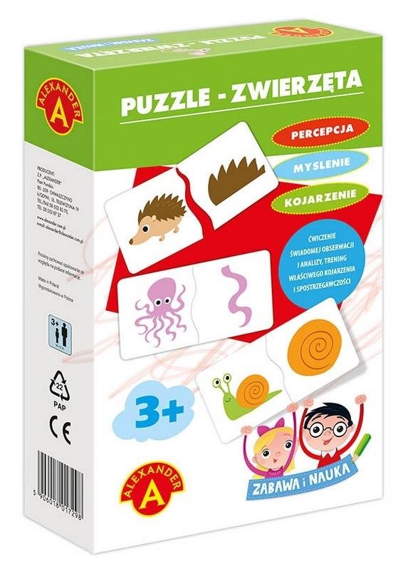 W pudełku znajdziemy 24 puzzle przedstawiające zwierzątka oraz tyle samo obrazków z różnymi fragmentami ich ciała. Zabawa polega na tym, aby właściwie dopasować poszczególną cześć ciała zwierzątka do jej właściciela. Czy dany puzzel przedstawia ogonek myszki, mackę ośmiorniczki czy trąbę słonika?