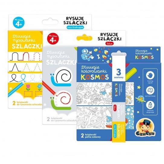 Kredki w dłoń, czas kontynuować przygodę z kredkami. Rysujcie szlaczki i kolorujcie Kosmos! Kreatywny zestaw zawiera 3 tytuły: Dłuuugie rysowanki Szlaczki Łatwe, Dłuuugie rysowanki Szlaczki Nieco trudniejsze oraz Dłuugie kolorowanki Kosmos.