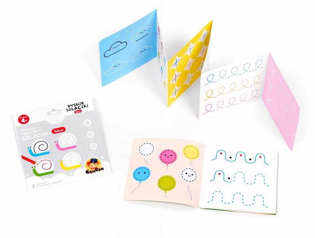 Zestaw 2 książeczek do rysowania i kolorowania, których formę i ilustracje dostosowano do wieku najmłodszych artystów.W dłuuugich książeczkach harmonijkach znajdziecie 23 ilustracje pełne prostych obrazków, które inspirują do rysowania szlaczków. To naturalny wstęp do przyszłej nauki pisania...