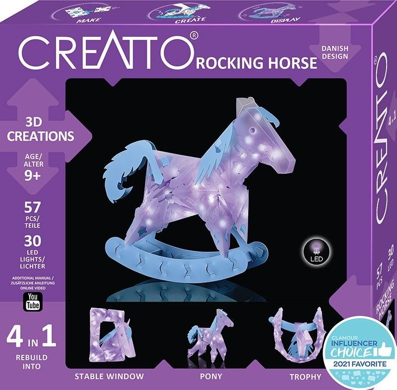 CREATTO to doskonały sposób, żeby spędzić czas z dzieckiem, jednocześnie razem tworząc coś magicznego. Z wytrzymałych, plastikowych elementów tworzymy trójwymiarowe figurki, które są podświetlane od środka światełkami LED. Mogą służyć nie tylko jako niezwykła lampka nocna ale również przywoływać wspomnienia wspaniałej, wspólnej zabawy. Używając tego zestawu można stworzyć konika na biegunach, konia w stajni, kucyka lub trofeum. Zawartość: światełka LED z pojemnikiem na baterie, plastikowe elementy konstrukcyjne, plastikowe elementy łączące. Wymaga 2 baterii AA (paluszki), baterie nie są załączone.
