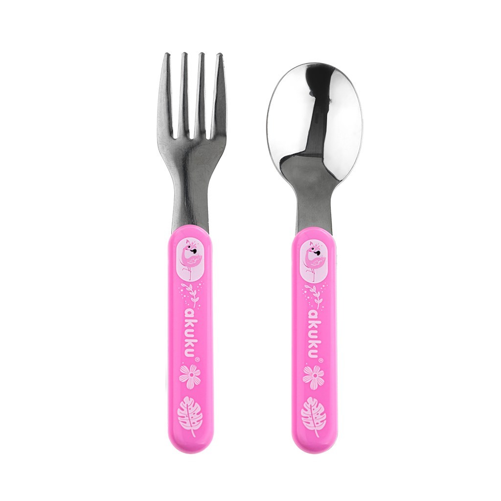 Dětská nerezová lžíce a vidlička Akuku růžová