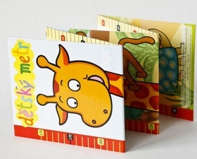 Takhle na obrázku to vůbec nevyzní, ale tenhle ten dětský metr je opravdu krásný. Předně je vyrobený opravdu z tvrdého papíru, nebo vlastně spíš asi kartonů, je to něco jako klasické rozkládací Leporelo. Z jedné strany je klasický metr k zavěšení do pokojíčku, zatímco z druhé strany jsou nějaké aktivity, už nevím přesně protože metr nám ty jsi samozřejmě žirafou a metrem nahoru. Pěkný, poctivý, a s hezkými obrázky.