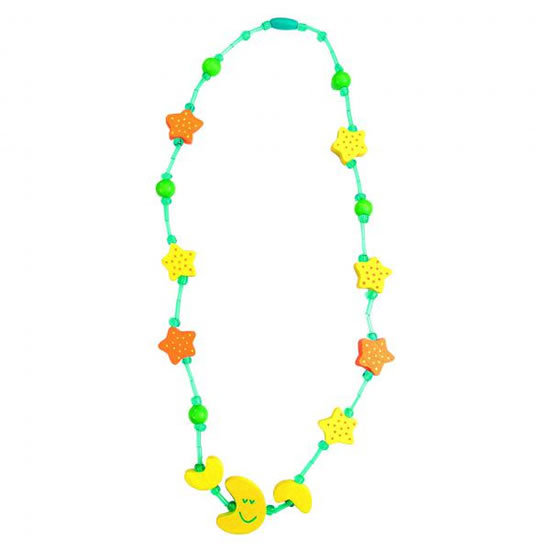 Moc hezký dřevěný náhrdelník pro malé holčičky, se kterým si mohou hrát na princezny a nebo ho jen tak nosit do školky. Náhrdelník je za pár korun a i přesto je moc hezky provedený a kvalitní, barvy se neoprýskaly. Na tkaničce jsou navlečeny různobarevné korálky, laděné do pastelových barev s doplňkem žluté barvy, hlavní jsou zde motivy hvězdiček a měsíčků. Určitě doporučuji ke koupi pro malé holčičky.