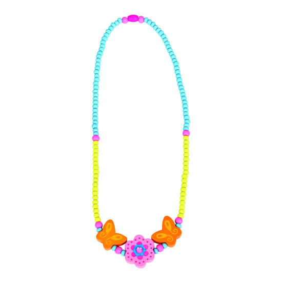 Pěkný náhrdelník s dřevěnými korálky ve žluté a modré pastelové barvě, doplněný dvěma oranžovými motýlky a růžovou kytičkou je vhodným dárkem pro malou princeznu. Náhrdelník lze vícekrát omotat a použít jako náramek, což je super. Holčičky si s touto hračkou opravdu vyhrají, když si hrají na princezny nebo ho mohou nosit jen tak na každodenní nošení. Osobně se mi líbí, že je náhrdelník vyroben ze dřeva a ne z plastu.