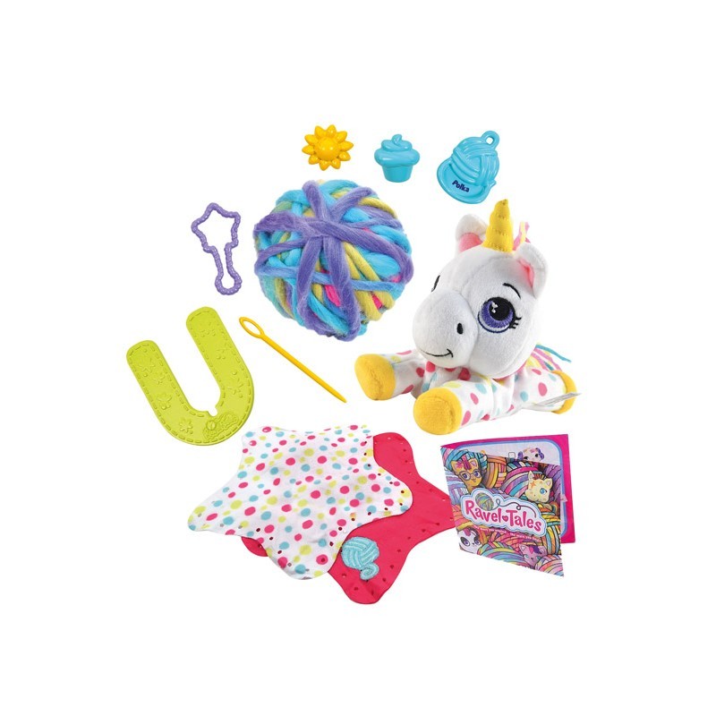 Rozmotejte klubíčko Ravel Tales a objevte spoustu překvapení! Vytvořte náramky, bambulky a pelíšek pro plyšáčka, kterého najdete uprostřed klubíčka. V každém klubíčku Ravel Tales se skrývá jeden ze 14 plyšáčků. Dva z nich jsou vzácní, se zlatými elementy. Jak na to: Nejdříve rozmotejte klubíčko. Uvnitř najdete: plyšáčka, pelíšek pro plyšáčka ze dvou částí, výplň pelíšku, jehlu na šití, vlnu a klip na bambulky, vlnu na náramek s přívěskem, vlnu na náhrdelník s přívěskem, vlnu na obojek s přívěskem, šablonu n