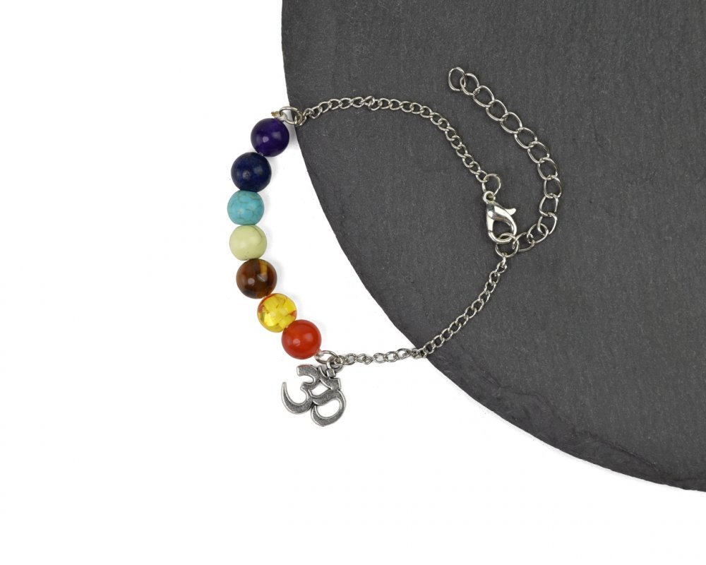 Náramek posiluje sedm hlavních čaker.ÓM je symbolem absolutna a sjednocení.Parametry: Délka: 19-24 cmPrůměr jedné kuličky: 8 mm Materiál: plast, kov