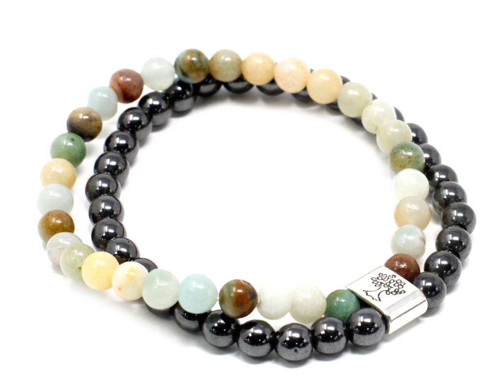 Amazonit je kamenem rovnováky, kontroly nad životem, intuice.Podporuje srdce, nervy, látkovou výměnu. Tlumí silné bolesti při migréně, podporuje řeč a výraznost projevu.Tyto náramky jsou dvojité (každý jeden náramek je složen z dvou - jeden barevný a jeden černý, kdy barevná část je složena ze vzácných kamenů a černá část je magnetická).Velikost: univerzální Průměr jedné kuličky: 6 mm Materiál: minerál, plast