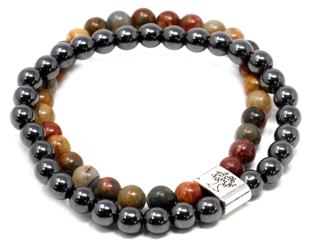 Jaspis Picasso pomáhá při alergiích, působí na trávicí trakt, posiluje krevní oběh. Zahání obavy a strach z budoucnosti, potlačuje žárlivost.Tyto náramky jsou dvojité (každý jeden náramek je složen z dvou - jeden barevný a jeden černý, kdy barevná část je složena ze vzácných kamenů a černá část je magnetická).Velikost: univerzální Průměr jedné kuličky: 6 mm Materiál: minerál, plast