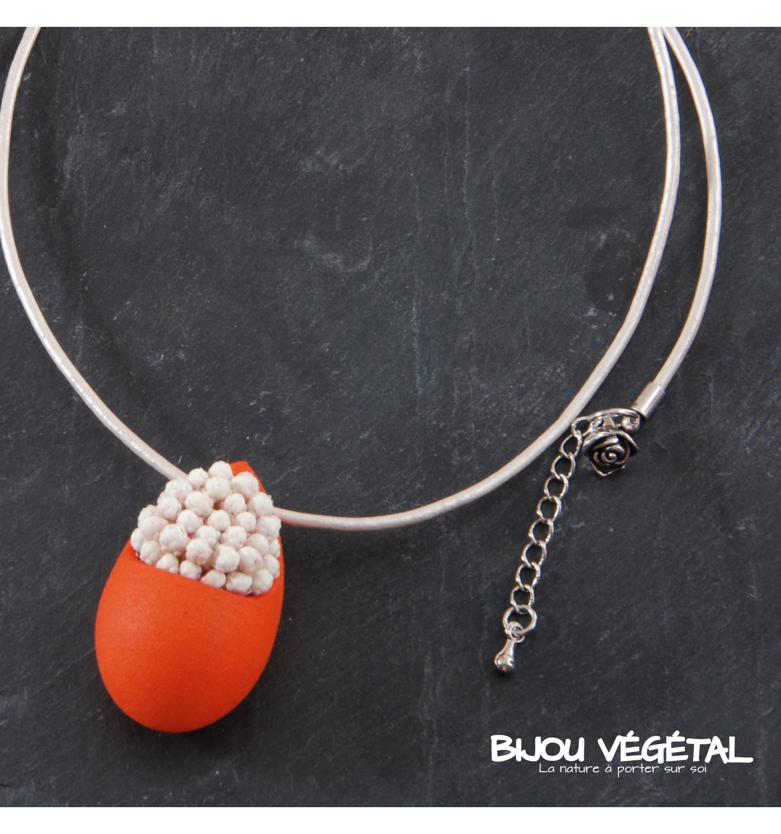 Živé šperky - Náhrdelník Slza oranžový s trvalými bílými květy Nádherný módní doplněk ve výrazné barvě v kombinaci s trvalými bílými květy vytváří neobyčejný elegantní živý šperk. Živé šperky jsou stabilizovány patentovanou technologií a nepotřebují prakticky žádnou údržbu. Živé šperky sou baleny v krabičce, součástí balení je náhradní trvalá rostlina. Živé šperky jsou vyrobeny ručně ve Francii. Výrobce garantuje neomezenou životnost, při vhodném používání. Živé šperky nesmí být vystaveny velkým teplotním změnám a přímému proudu vody (při koupání, mytí nádobí apod.) Živé šperky byly poprvé představeny na mezinárodním veletrhu klenotů Bijorhca v Paříži roku 2015. Vytvořily je designové návrhářky a dlouholeté kamarádky Maryse a Manuella pro společnost Radis et Capucine. Živé šperky umožňují stálé propojení s přírodou a přinášejí ji doslova na dosah ruky. Francouzská značka Radis et Capucine