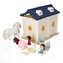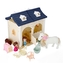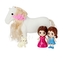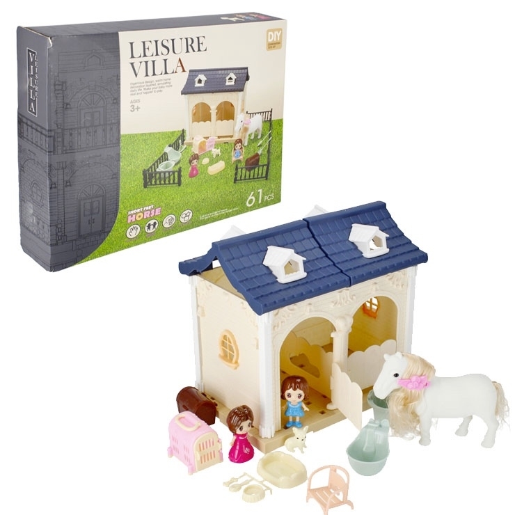 Sada obsahuje: stáj s ohrádkou, koníka, 2 figurky dívek, nosič zvířátek, pejska, pelíšek pro psa, misku, truhlu, židli, kbelík, podložku s travnatou úpravou.