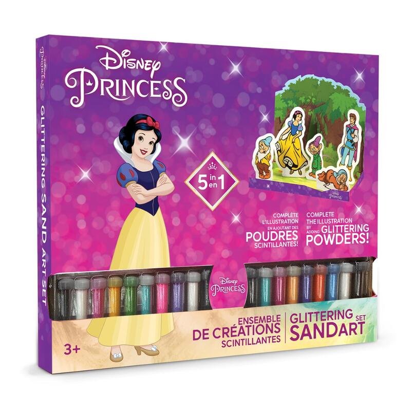 Pískování obrázků s motivy oblíbených postav ze Sněhurky.Sada obsahuje 5 speciálně vyřezaných licencovaných pískových kartiček podle konceptu včetně stojánků, pinzetu, 20 tub s barevným pískem, kartonové pozadí a stolek.Před použitím odstraňte obal a uchovejte pro další použití!Nevhodné pro děti do 3 let.Velikost balení: 32 x 34,5 x 4,5 cm.Návod k použití:1/ Sloupni jednotlivé části samolepícího papíru, nanes písek a přebytečný odstraň. Doporučujeme začít obrysy černým pískem. Barevný obrázek slouží jako př