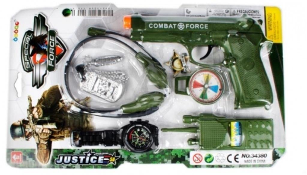 Kompletny zestaw dla każdego młodego żołnierza.Zestaw zawiera pistolet, krótkofalówkę, słuchawki, kompas, zegarek oraz odznakę.Zabawki wykonane są z plastiku. Nie wymagają zasilania bateriami.Wymiary opakowania: 22.0 x 37.0 x 4.0 cm