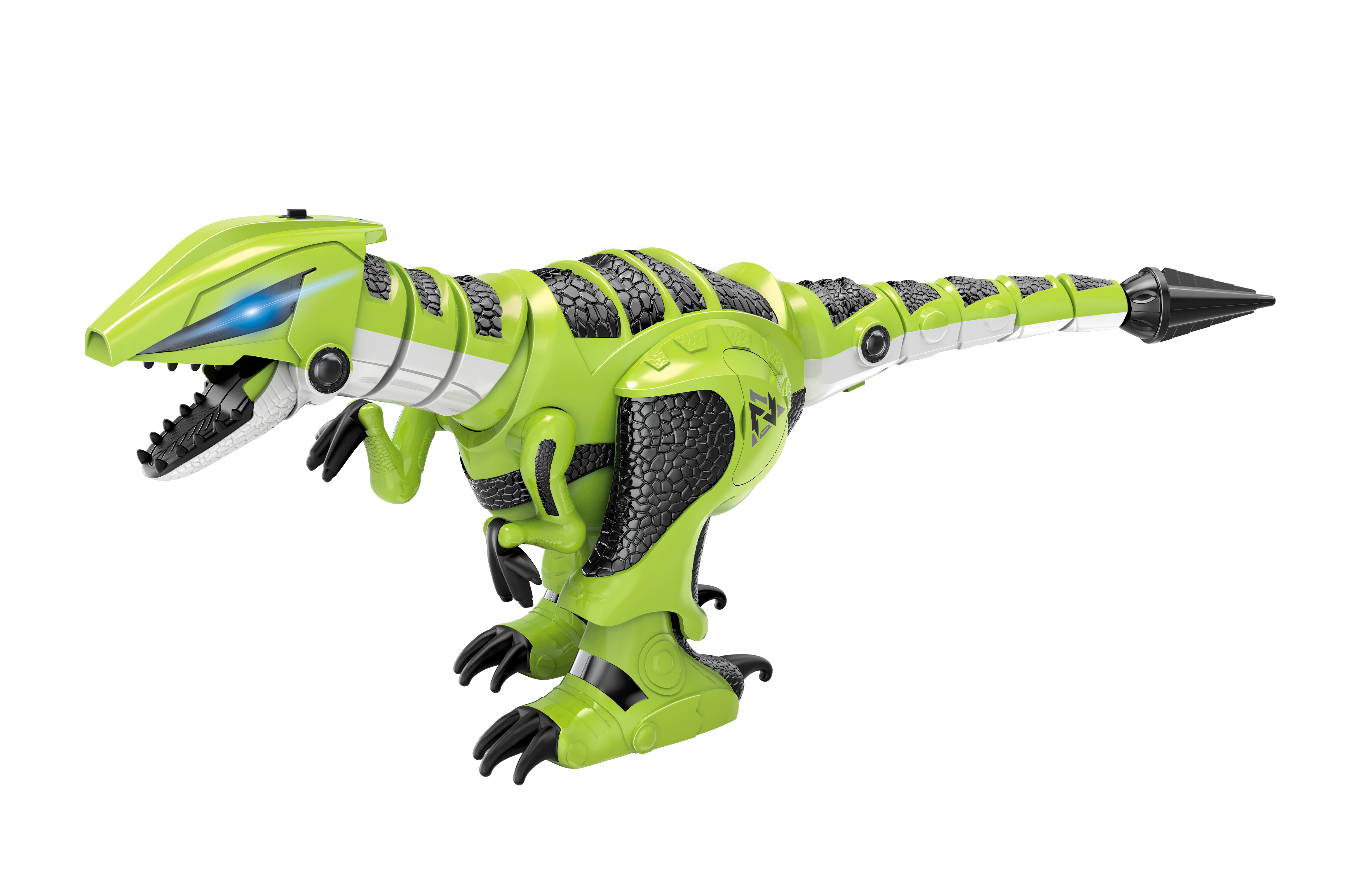Dinosaurus RC na dálkové ovládání. Rozměry 64x15,7x25,3 cm. Světelné, zvukové a kouřové efekty. Bateriový pack 3.7V do dinosaura součástí, 2xAA do ovladače nejsou součástí. USB kabel součástí. Přepínač ON/OFF ze spodu dinosaura. Nádržka na vodu na hlavě. Nádobka na vodu součástí. Funkce - chůze dopředu, dozadu, otáčení vlevo, vpravo, programování, kouř, hudba, nastavení hlasitosti, ovládání dotykem (dotyk pod spodní čelistí). Složte dle obrázku na spodní straně obalu.