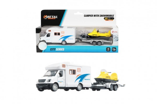 Auto obytné se snowmobilem kov/plast 22cm na zpětné natažení v krabičce 24x12x6cm