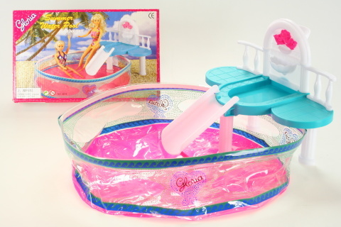 Glorie Bazén sada obsahuje bazén z pevného PVC o rozměrech cca 38 cm a plastovou skluzavku o rozměrech cca 29 cm X 30 cm X 24 CM.Panenka není součástí balení.Věk 3+ číst celé