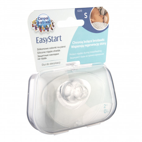 Silikonové chrániče prsních bradavek EasyStart chrání bolavé bradavky během období hojení podráždění nebo poškození pokožky, poskytují ženě pocit pohodlí a umožňují jí pokračovat v kojení. Chrániče jsou vyrobeny z kvalitního silikonu, který neobsahuje BPA ani jiné škodlivé látky - jsou bezpečné a vhodné pro přímý kontakt s mateřským mlékem. Měkký a jemný silikon perfektně sedí a přilne. Použití chráničů nemění chuť ani vůni mateřského mléka, takže je dítě při sání mléka snadno přijme. Měkký povrch chrániče bradavek imituje texturu matčiny pokožky, což navíc poskytuje miminku pocit pohodlí a blízkosti. Chrániče jsou speciálně tvarované - horní okraj je o něco užší, aby se miminko při kojení mohlo přitulit přímo k matčině prsu, cítit její teplo a vůni její pokožky. Silikonové chrániče na bradavky jsou k dispozici ve speciálním pouzdře, které je ideální pro skladování, ale také pro rychlou sterilizaci v mikrovlnné troubě, takže je snadné udržovat chrániče čisté a hygienické. Balení obsahuje 2 kusy.Průměr otvoru pro bradavku (v nejširší části):Velikost S: 15,10mmVelikost M/L: 18,60mm Chrání bolavé a popraskané bradavky, čímž urychlují regeneraci pokožky.Jsou vyrobeny ze super tenkého silikonu a umožňují bezbolestné kojení.Horní, mírně užší okraj chrániče bradavek umožňuje miminku obejmout maminčina prsa, cítit vůni její kůže a teplo při kojení.Profilovaný tvar zajišťuje blízký kontakt matky a miminka.Bez zápachu - nemění chuť ani vůni mateřského mléka.Pouzdro pro skladování a rychlou sterilizaci v mikrovlnné troubě.Doplňující informace:Chrániče bradavek jsou k dispozici ve dvou velikostech: S (malé) a M/L (standardní). Průměr otvoru pro bradavku v nejširším místě: Velikost S: 15,10mm, Velikost M/L: 18,60mm.Návod, jak sterilizovat chrániče prsních bradavek ve sterilizačním pouzdře:UPOZORNĚNÍ! Nedodržení tohoto pokynu může vést k popálení nebo poškození výrobku a/nebo mikrovlnné trouby.• Před použitím vždy zkontrolujte hladinu vody ve sterilizačním pouzdře. • Oba dva chrániče prsních bradavek lze sterilizovat najednou v jednom pouzdře.• Tento výrobek není hračka. Používejte a skladujte mimo dosah dětí.POUŽITÍ:1. Před prvním a každým dalším použitím umyjte sterilizační pouzdro v teplé vodě s jemným mycím prostředkem, důkladně opláchněte.2. Přilijte 25ml převařené vody. DŮLEŽITÉ přidání malého množství vody může sterilizační pouzdro poškodit. Přidání příliš velkého množství vody může mít za následek neúčinnou sterilizaci.3. Vložte chrániče prsních bradavek do sterilizačního pouzdra.4. Nasaďte víko a pevně uzavřete.5. Uzavřené sterilizační pouzdro vložte do mikrovlnné trouby.6. Pro mikrovlnné trouby o výkonu 750-1000W je doba sterilizace 2 minuty. Tuto dobu nepřekračujte.UPOZORNĚNÍ!• Pouzdro musí být během dezinfekce umístěno na rovném povrchu. • Před vyjmutím pouzdra z mikrovlnné trouby vždy počkejte alespoň 5 minut, než pouzdro vychladne. Buďte velmi opatrní při vyndávání pouzdra z mikrovlnné trouby a při otevírání.• Vylejte zbývající vodu ze sterilizačního pouzdra přes určený otvor, opláchněte a osušte.• Buďte opatrní při vyndávání dezinfikovaných chráničů, mohou být horké. • Před další sterilizací počkejte 15minut, než pouzdro úplně vychladne. Jak používat:Udržujte chrániče prsních bradavek čisté. Před prvním a každým dalším použitím je umyjte v teplé vodě s jemným mycím prostředkem a důkladně opláchněte. Chrániče bradavek dezinfikujte ve vroucí vodě asi 3 minuty. Chrániče bradavek nemyjte v myčce na nádobí. K čištění nepoužívejte antibakteriální prostředky. Během používání a čištění se vyvarujte hrubých nástrojů, které by mohly poškrábat povrch. Chrániče bradavek lze dezinfikovat v přiloženém pouzdře dle návodu. Nenechávejte chrániče bradavek na přímém slunci nebo v blízkosti zdroje tepla. Chránič aplikujte pouze na suché a čisté prso. Nepoužívejte žádné krémy ani vazelínu. Před každým použitím výrobek zkontrolujte. Při prvních známkách poškození nebo opotřebení vyhoďte. Nezvětšujte otvory a nevytvářejte další otvory v chráničích bradavek, protože by mohlo dojít k poškození. Před použitím přípravku se doporučuje poradit se s porodní asistentkou nebo pediatrem. UPOZORNĚNÍ! Tento výrobek není hračka. Uchovávejte mimo dosah dětí. Čisté a suché chrániče bradavek uložte do pouzdra. Uschovejte si návod k použití, protože obsahuje důležité informace. Kód šarže je na obalu.