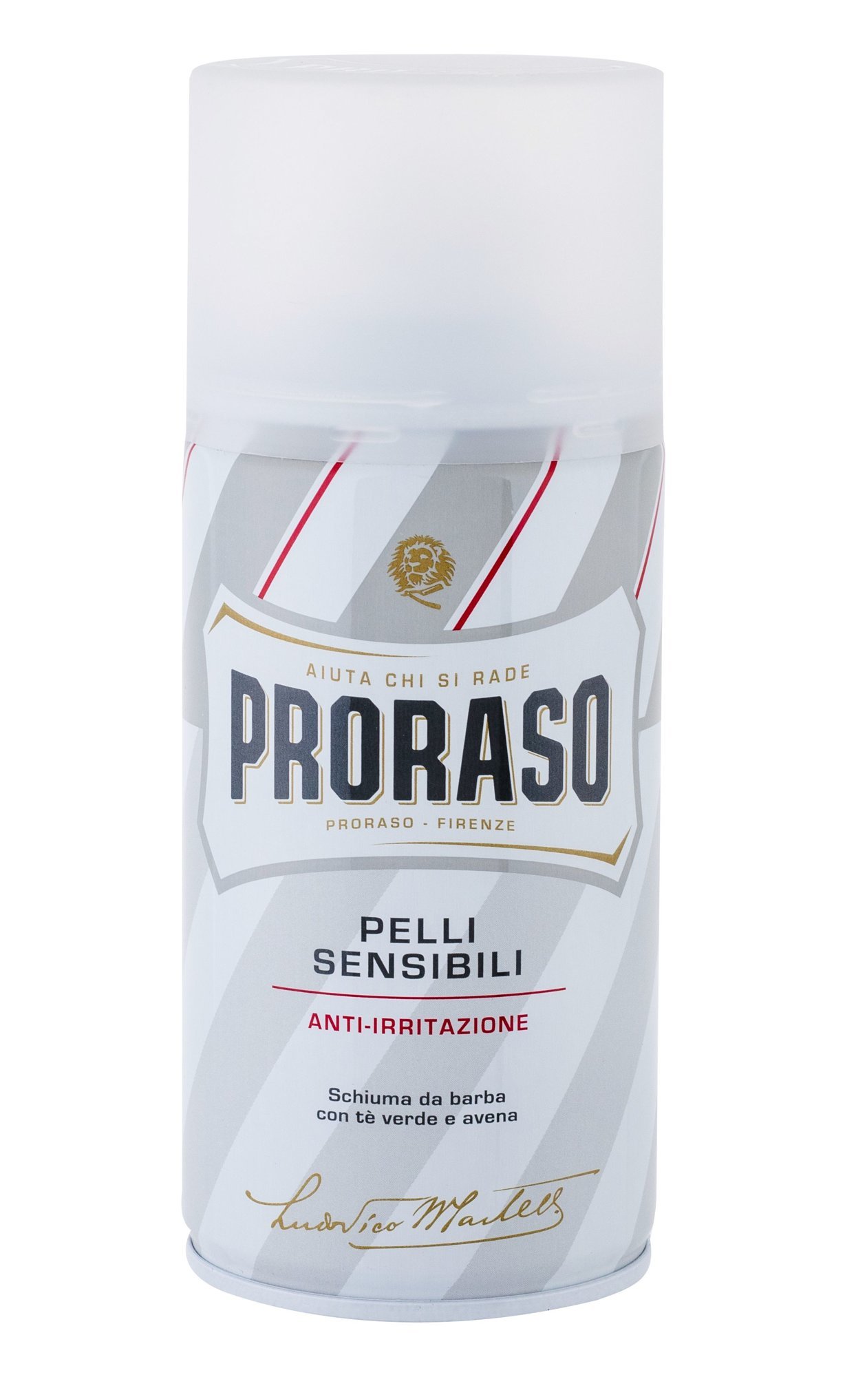 Pěna na holení **PRORASO White** se zeleným čajem a ovesnými vločkami má na pleť výrazný **zklidňující účinek.** ### Čím se vyznačuje pěna na holení PRORASO? * zjemňuje pokožku a zvyšuje její pružnost, * bohatá pěna umožňuje dokonalé oholení, * čistí a tonizuje, * zklidňuje podráždění a pálení, * neobsahuje parabeny, silikony, minerální oleje, SLS, * dermatologicky testováno, * **pro všechny typy pleti včetně citlivé.** ### Jakým způsobem pěnu na holení aplikovat? Před aplikací pěnu protřepejte. Aplikujte na obličej navlhčený teplou vodou.